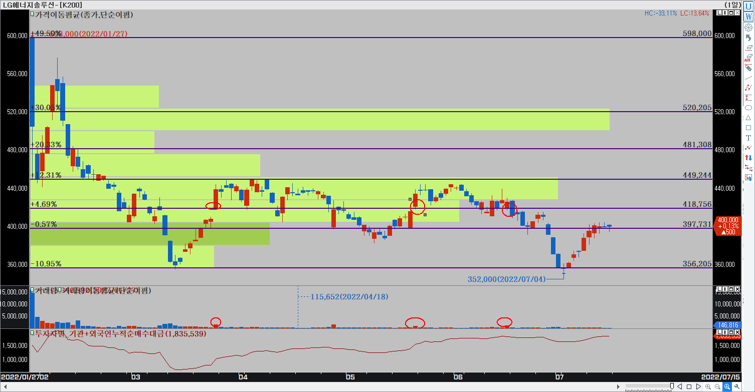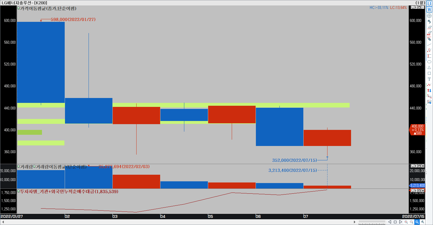 LG에너지솔루션 상장 당시 따상을 가네 마네 했지만, 결국 60만 원의 벽을 못 넘고 최근엔 35만 원대 저점을 찍어주었다.